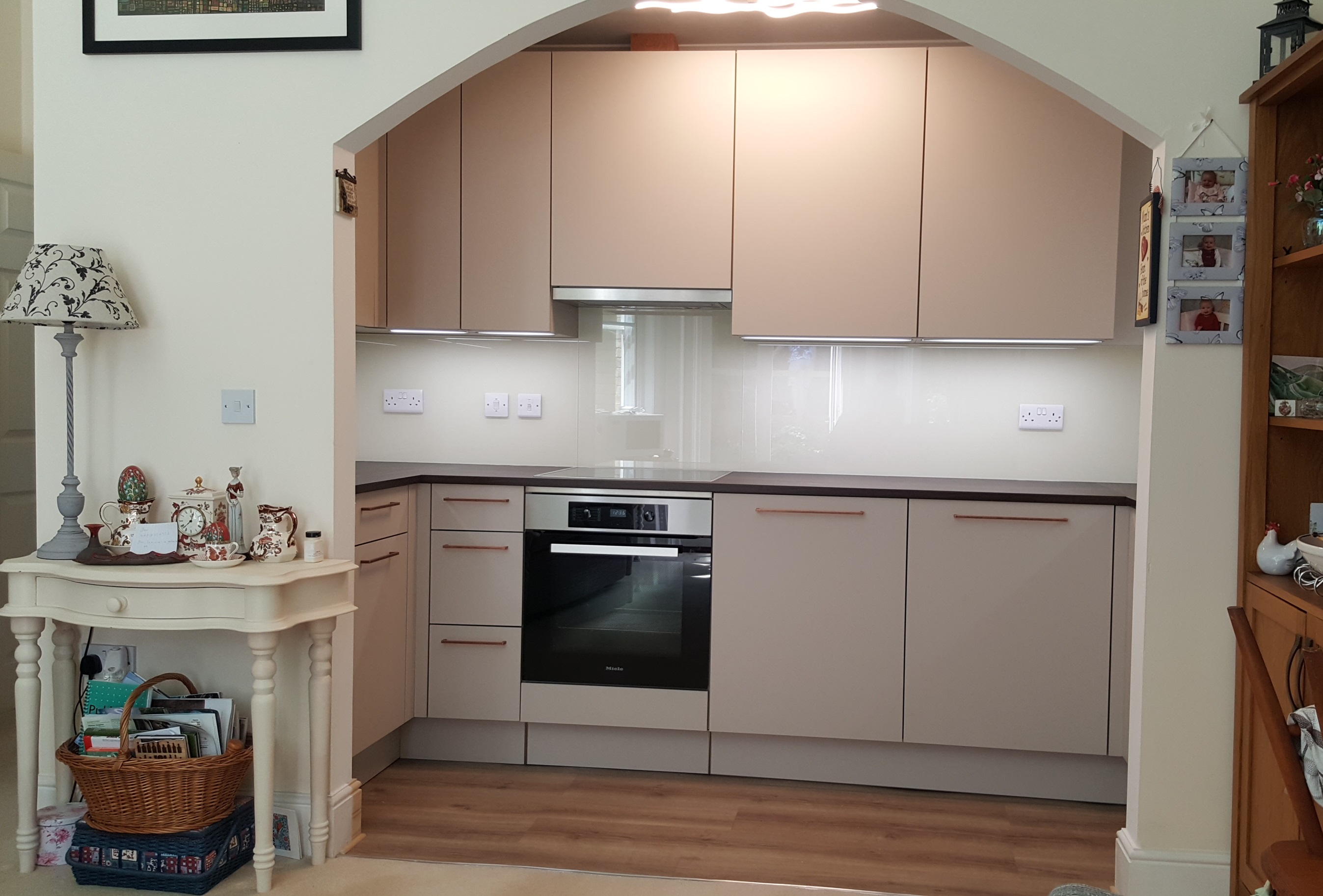 We were able to fit the following appliances into this small space to create an attractive compact kitchen. built in Washing machine, fridge, oven, hob, extractor and sink & tap. Also finished with white glass splash backs.