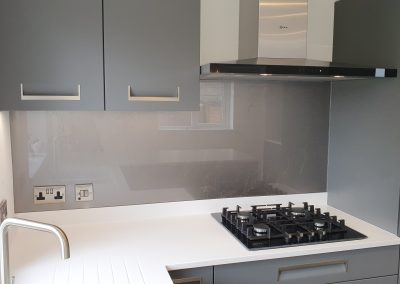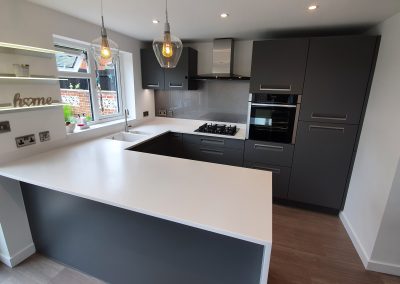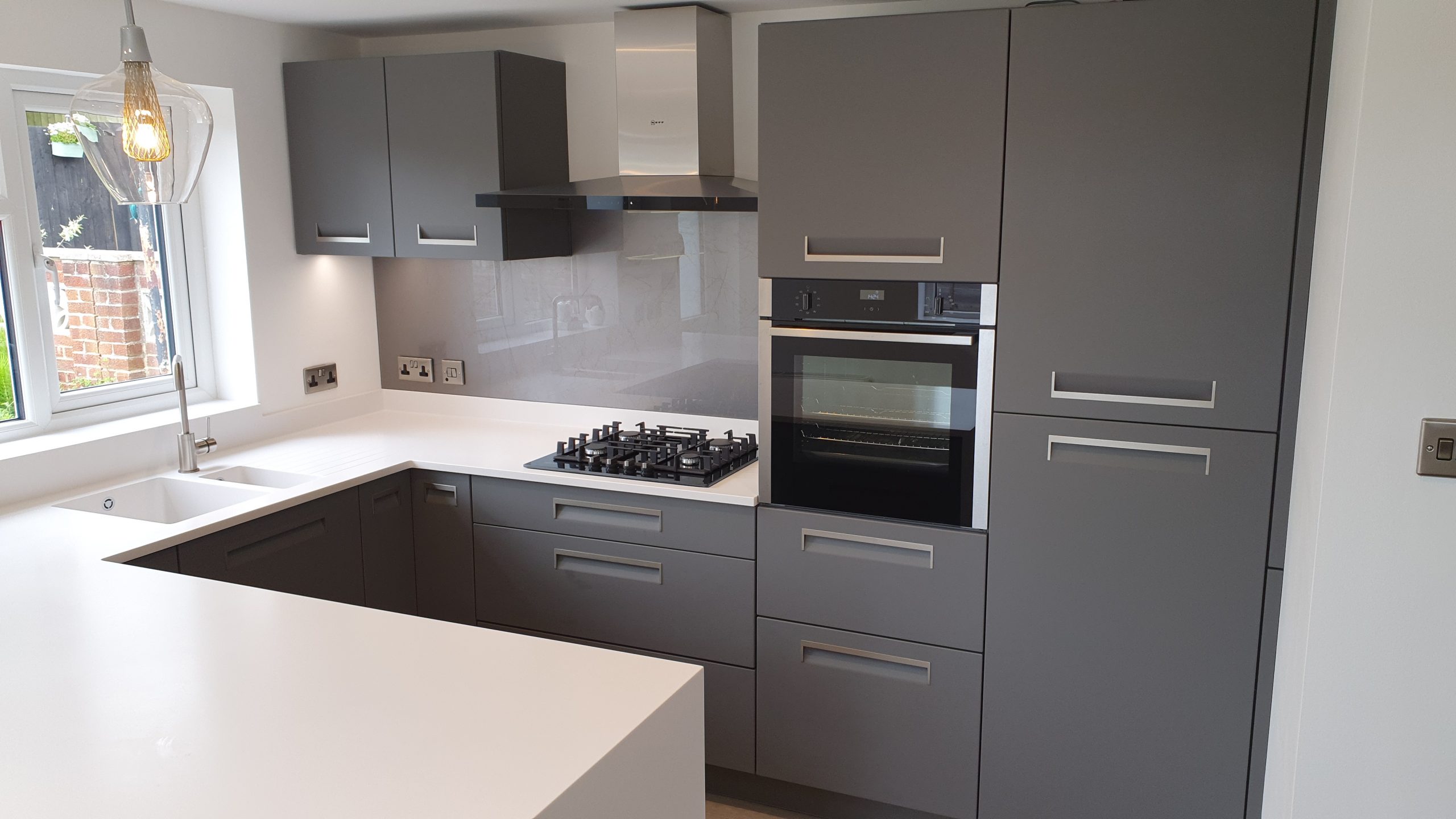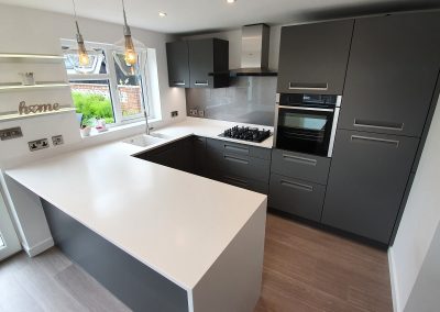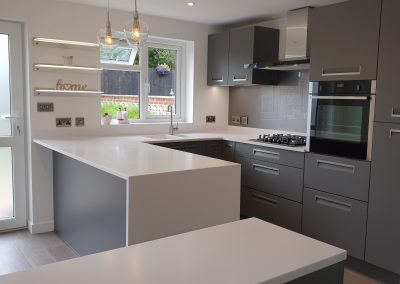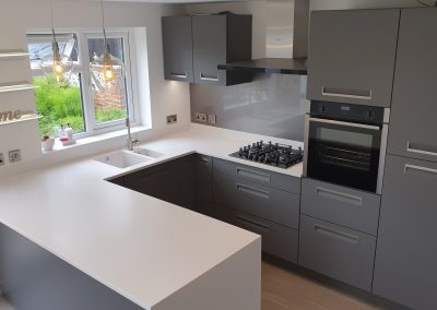 This kitchen in Ryde has Sleek ‘Integra’ handles that are integrated into the dark grey doors and topped with stunning white corian worktop and wrap around side panel. It is finished off with a one piece glass splashback with splattered gold effect.