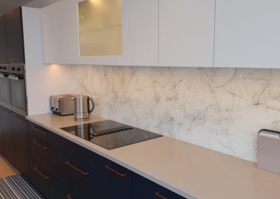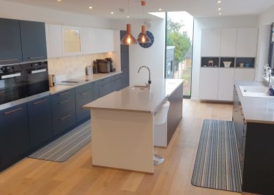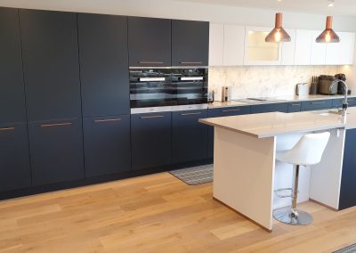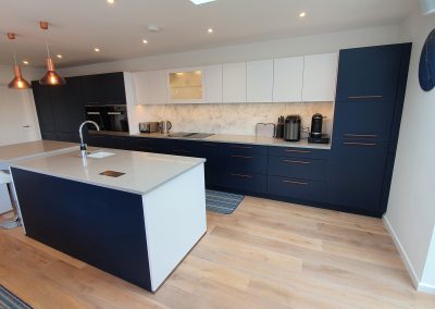 This stunning large kitchen is located in Ryde and has a wonderful sea view. Combining our deep blue and white doors with a glass splash back that has a splattered paint effect. It features a Miele self-extracting hob so no over-head extractor is needed. Despite the generous size of this kitchen, a small sink directly opposite the hob means the working triangle is nice and compact. Solid Silestone worktops and aged copper handles complete the look of this contemporary kitchen.