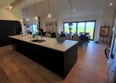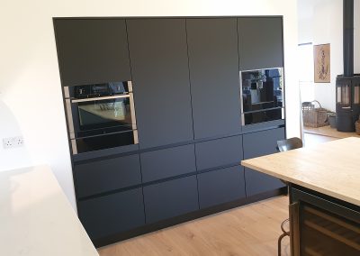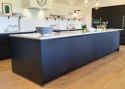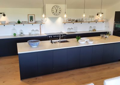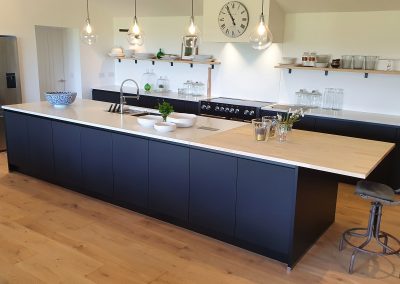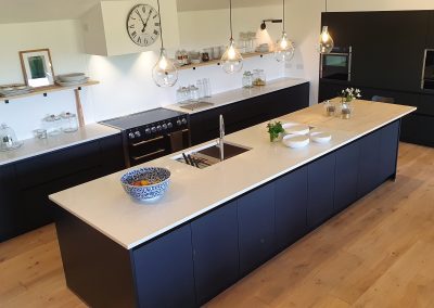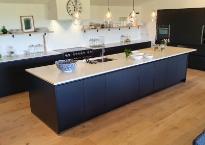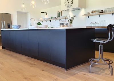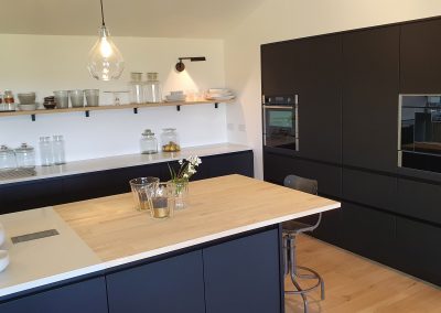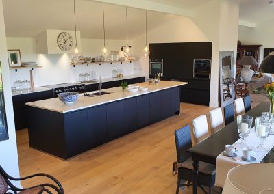 A stunning contemporary black kitchen designed with the Nolte Matrix-Art handless system with spectacular views across fields and the English channel. Topped off with quartz worktop and Natural Spekva timbe, this kitchen shows what can be achieved in a large open plan space.