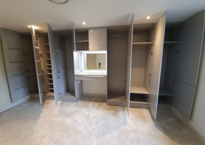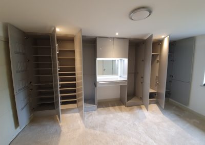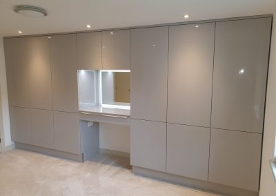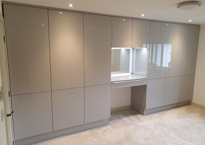 A minimal design, handless push to open modular wardrobe with illuminated mirror in a dressing room. This has been installed by our fitters in a large contemporary house in Ryde and includes a socket in the side of the wardrobe under the dressing table. It spans 4.6 metres, floor to ceiling and cost £8000.