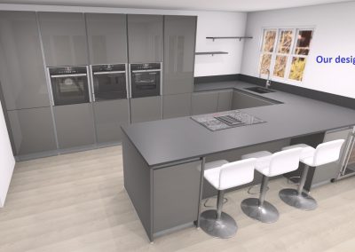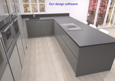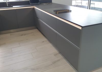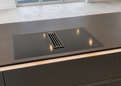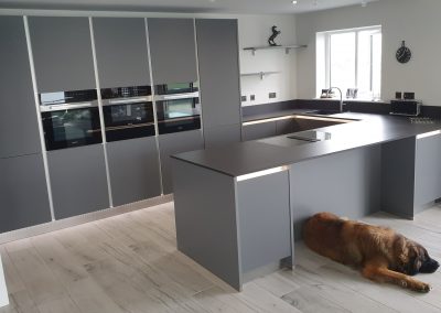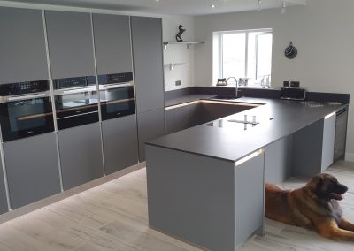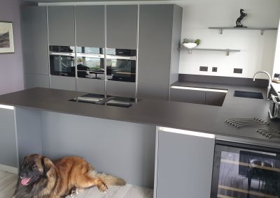 Last year we installed this stunning kitchen with matt glass doors in a penthouse apartment in Sandown, Isle of Wight. Equipped with top of the range Miele appliances, including a self extracting Miele hob which has a spectacular view of the English channel. This design has been created using the Nolte matrix-art handless system which has LED lighting as an optional extra. The worktop is 20mm thick Dekton Doomos and the dog is also a top of the range German import…