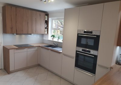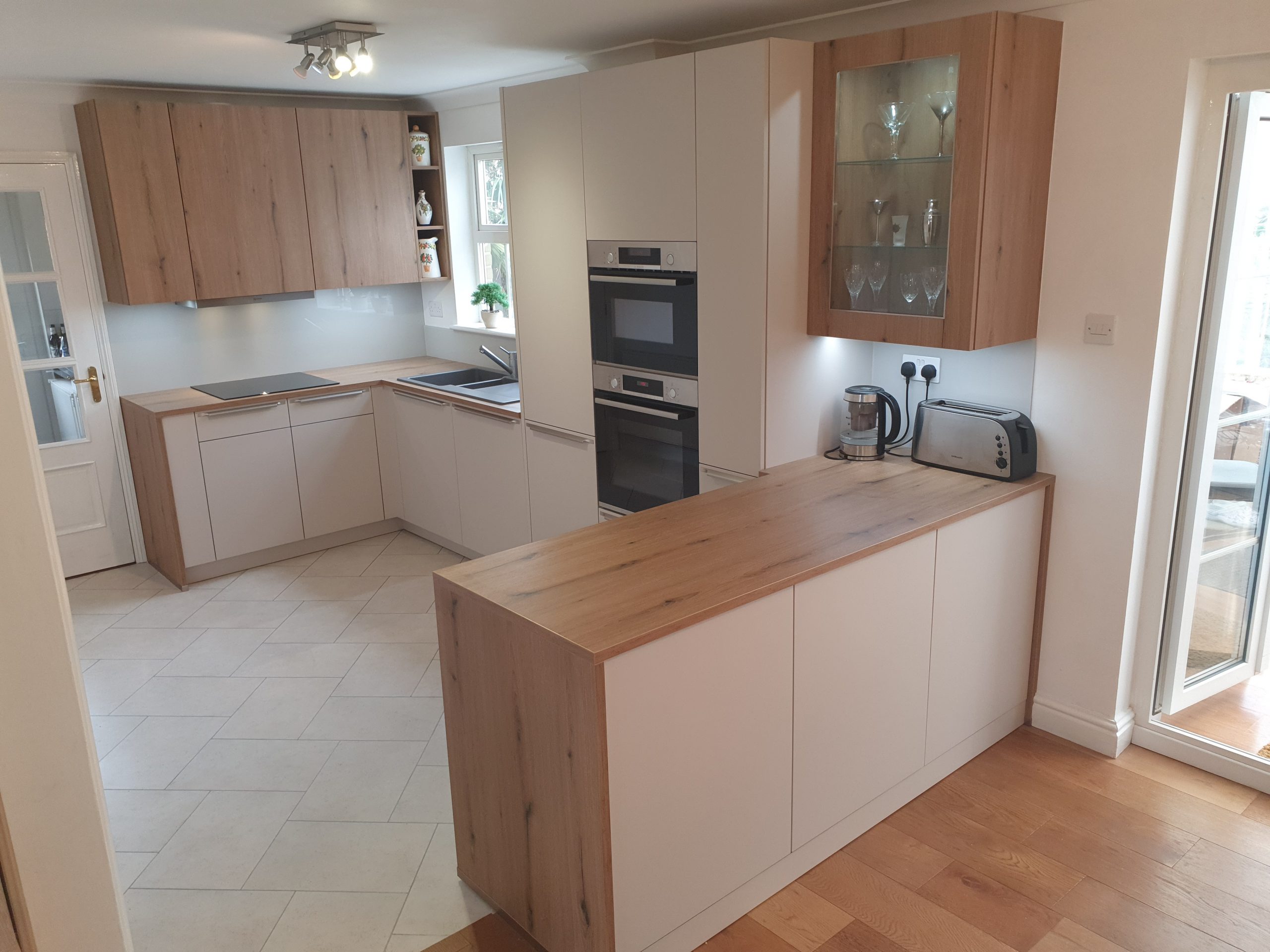 A timeless contemporary kitchen with warm tones, combining the Nolte Manhattan Chalet Oak doors & worktop with Sahara matt doors.