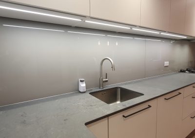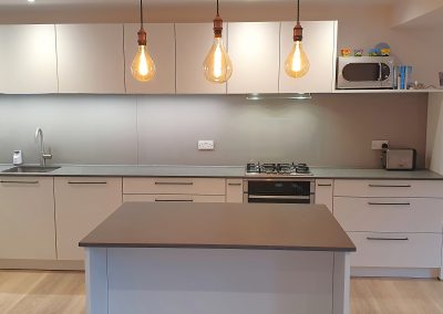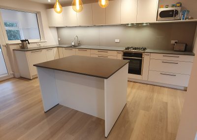 A clean and simple contemporary white kitchen with quartz grey worktop installed in Bembridge by our fitting team.
