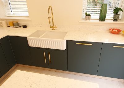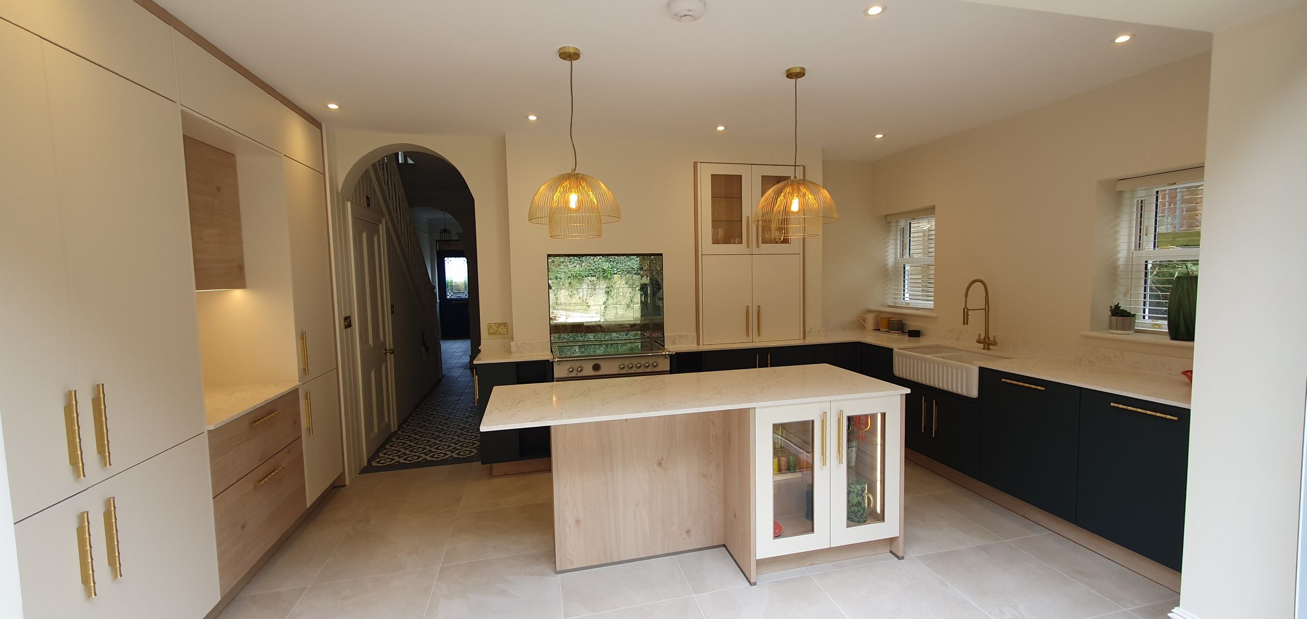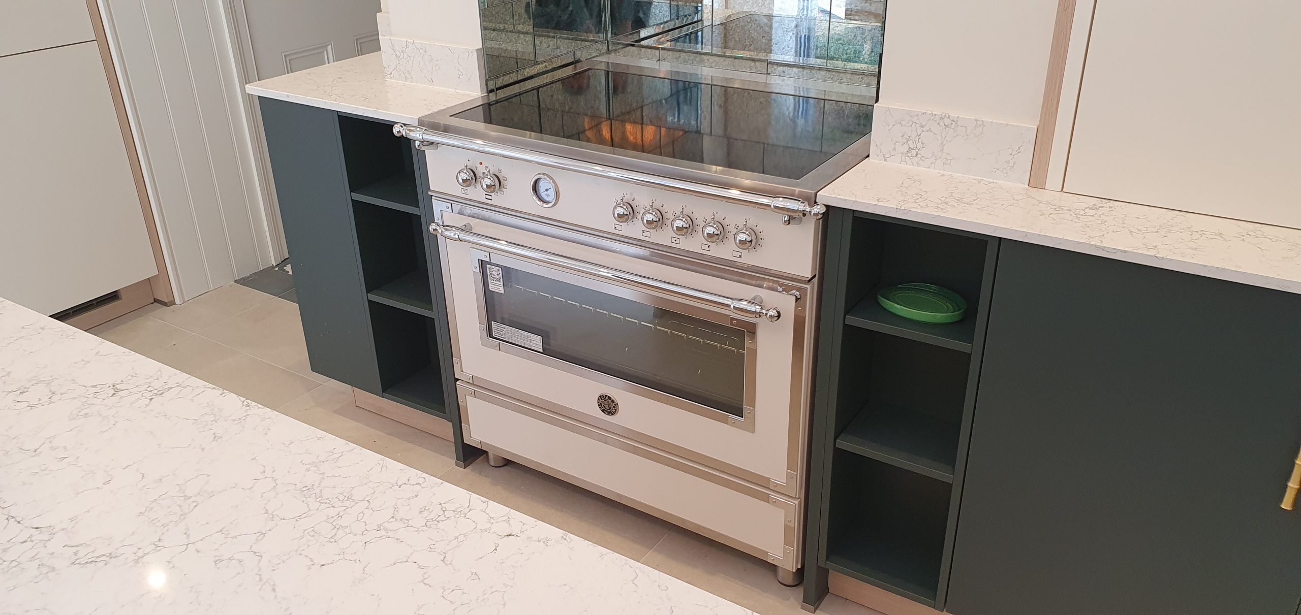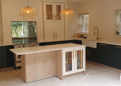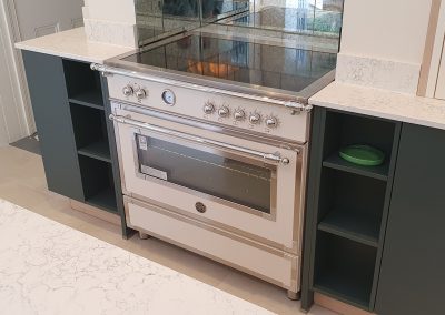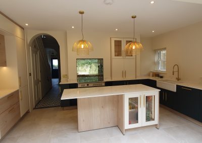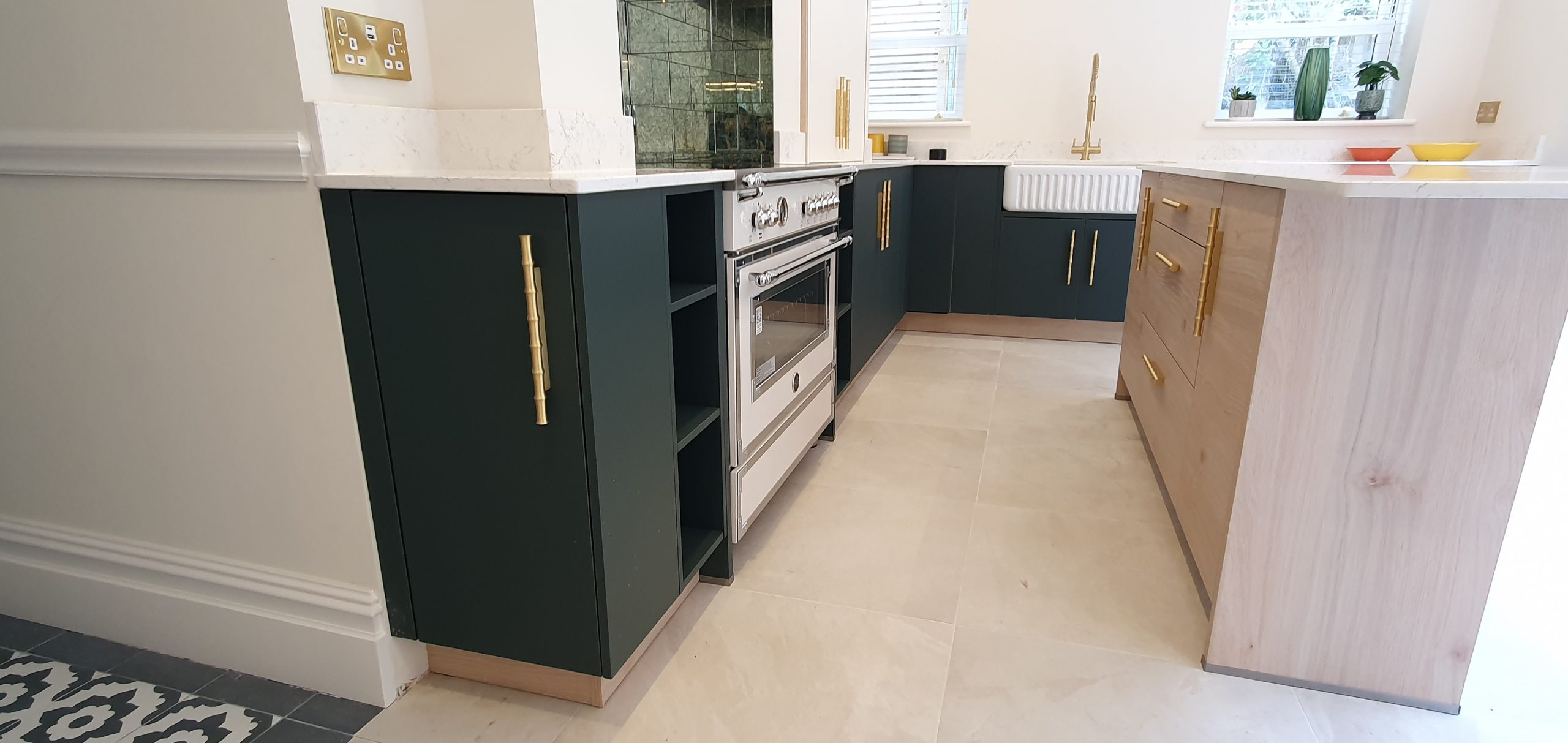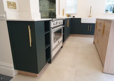 We recently completed this distinctive kitchen as part of a remarkable Victorian house renovation in Ventnor, Isle of Wight. Designed in collaboration with Leah Mew Architecture, the space combines timeless elegance with contemporary detailing. The kitchen features Nolte Black-Green cabinetry paired with magnolia doors, creating a rich and balanced contrast. Illuminated glass cupboards with integrated side lights, along with seamless under-cabinet lighting, add warmth and depth to the room. Durable and striking Caesarstone Arabetto worktops offer both beauty and longevity. A ribbed Thomas Denby sink, paired with a classic brass tap, brings a refined traditional touch, echoed in the brass handles throughout. At the heart of the kitchen is a professional-grade Bertazzoni range cooker, crafted in Italy — making every cooking experience a pleasure.