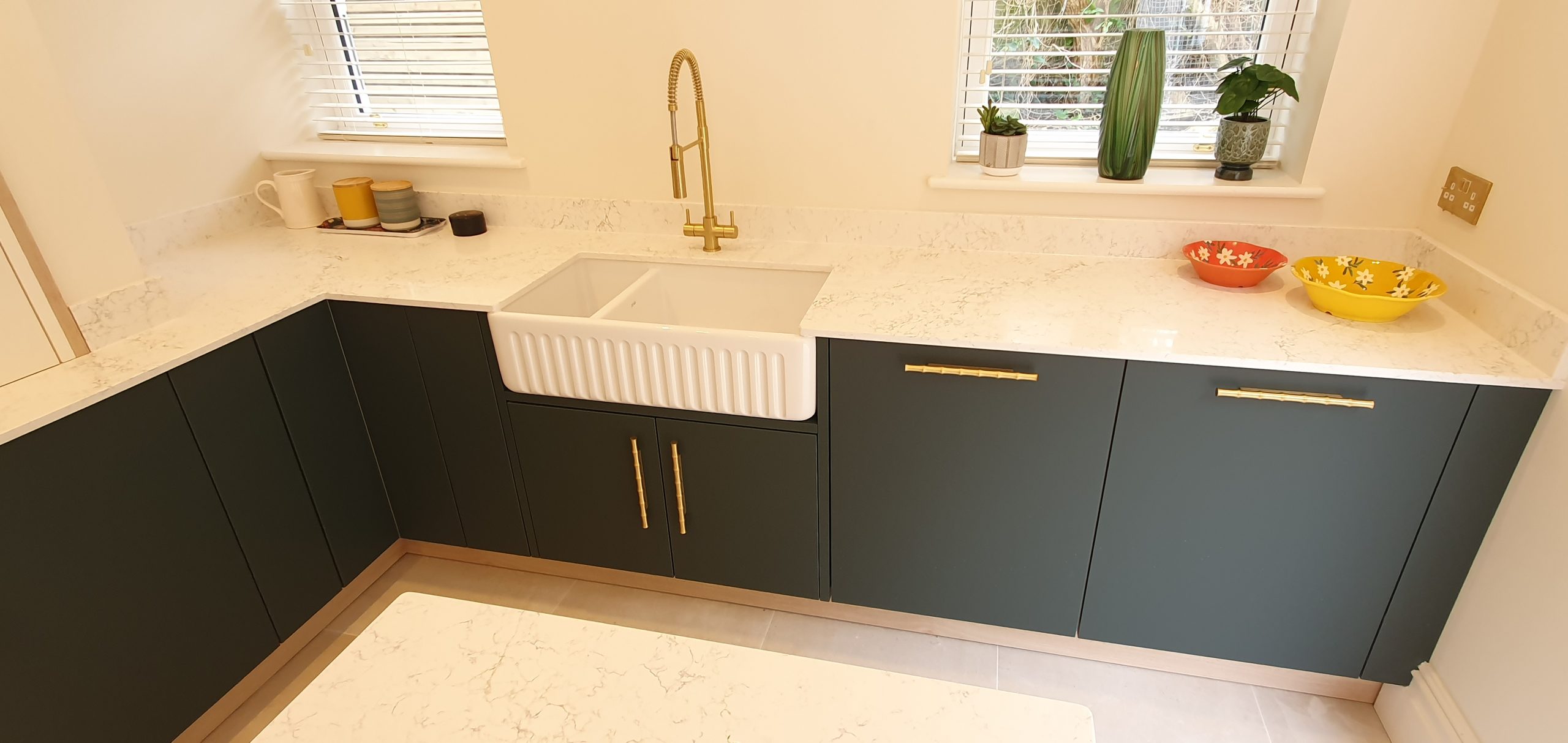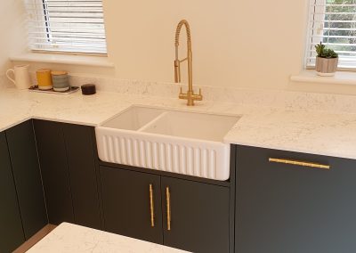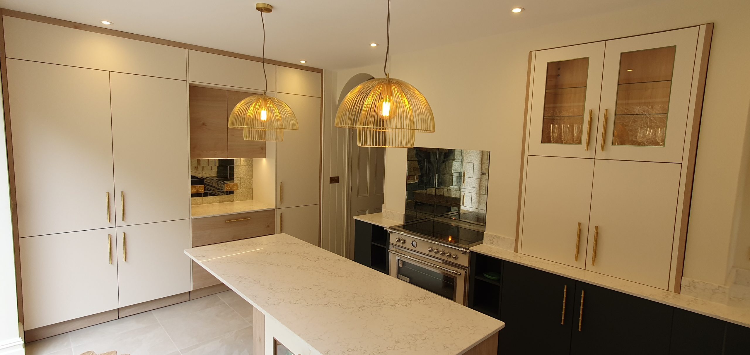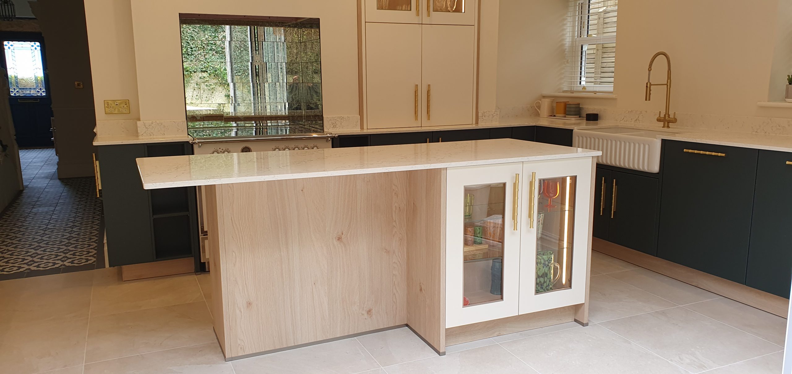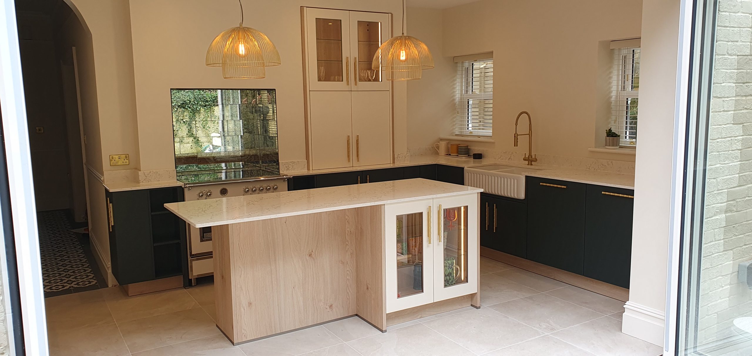 We recently completed this distinctive kitchen as part of a remarkable Victorian house renovation in Ventnor, Isle of Wight. Designed in collaboration with Leah Mew Architecture, the space combines timeless elegance with contemporary detailing. The kitchen features Nolte Black-Green cabinetry paired with magnolia doors, creating a rich and balanced contrast. Illuminated glass cupboards with integrated side lights, along with seamless under-cabinet lighting, add warmth and depth to the room. Durable and striking Caesarstone Arabetto worktops offer both beauty and longevity. A ribbed Thomas Denby sink, paired with a classic brass tap, brings a refined traditional touch, echoed in the brass handles throughout. At the heart of the kitchen is a professional-grade Bertazzoni range cooker, crafted in Italy — making every cooking experience a pleasure.