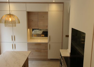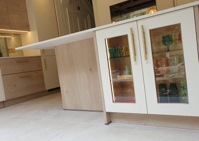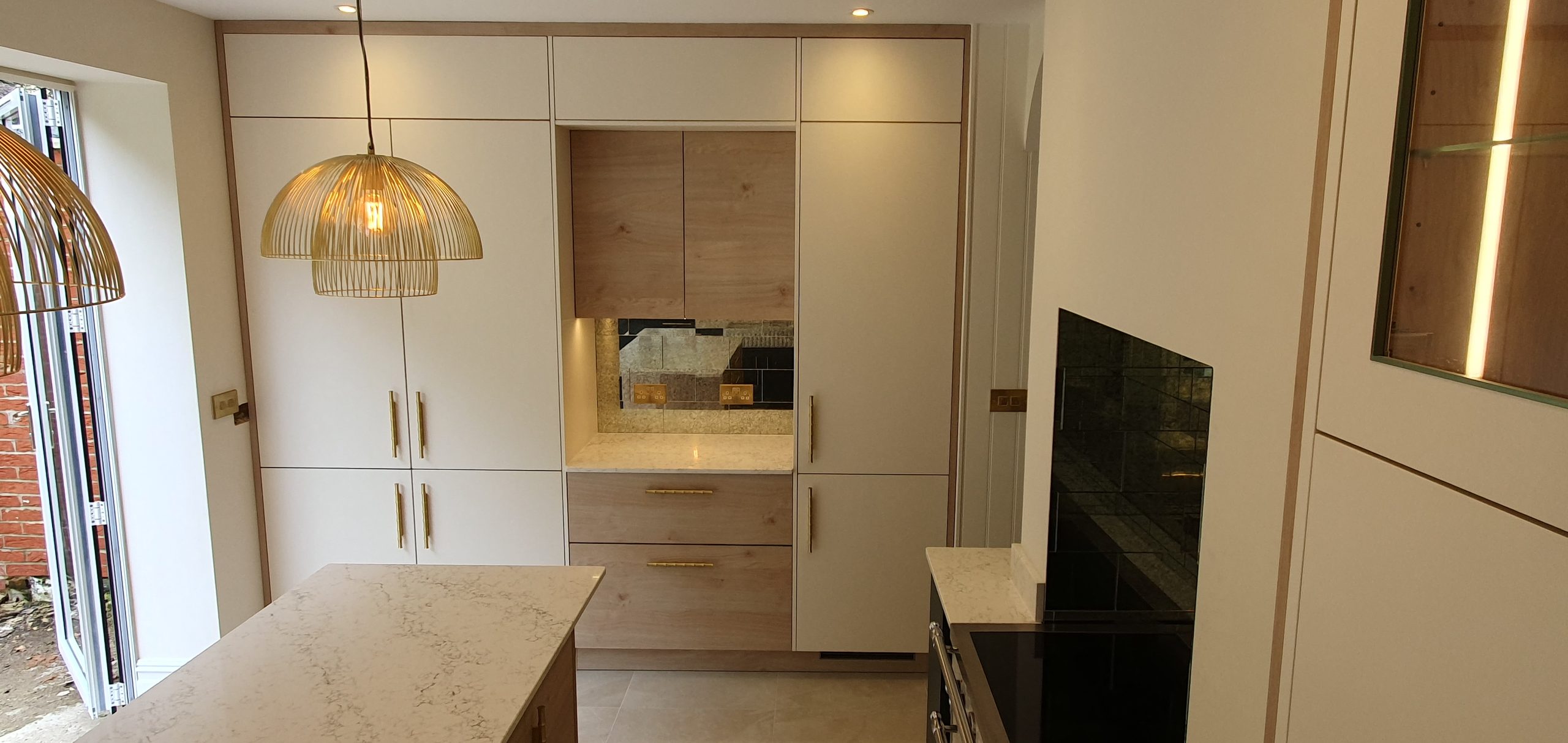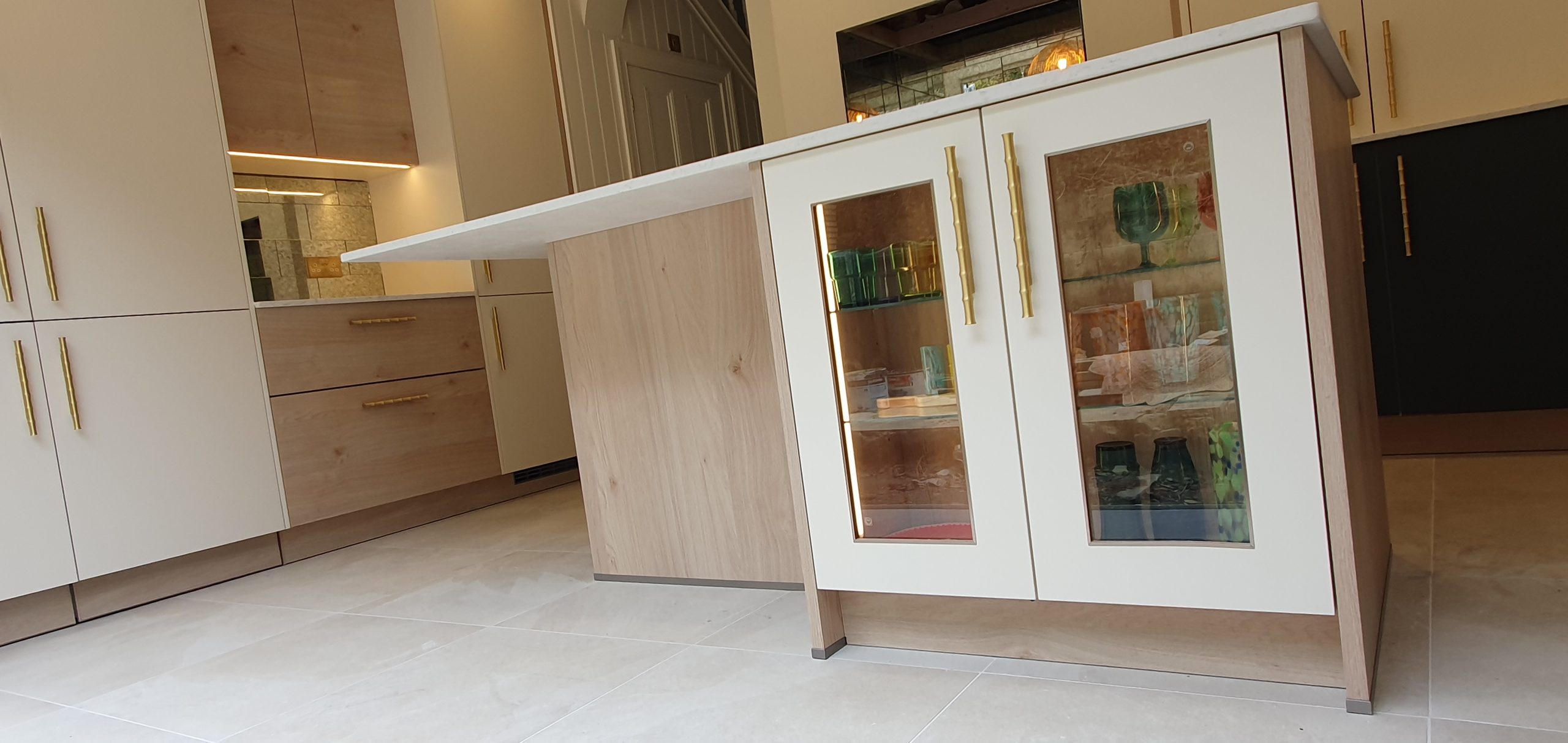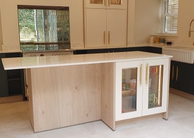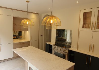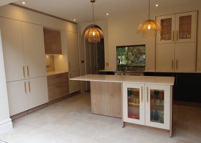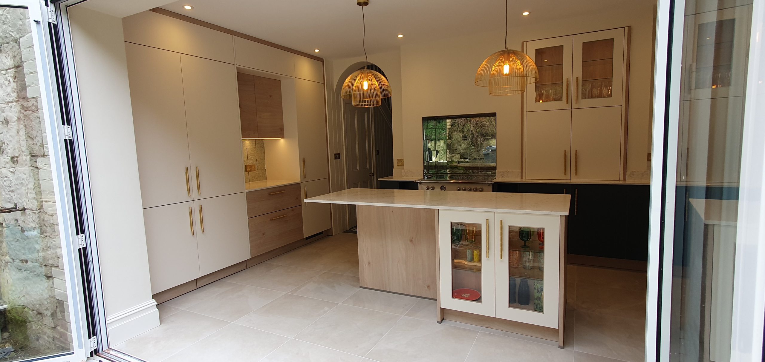 We recently completed this distinctive kitchen as part of a remarkable Victorian house renovation in Ventnor, Isle of Wight. Designed in collaboration with Leah Mew Architecture, the space combines timeless elegance with contemporary detailing. The kitchen features Nolte Black-Green cabinetry paired with magnolia doors, creating a rich and balanced contrast. Illuminated glass cupboards with integrated side lights, along with seamless under-cabinet lighting, add warmth and depth to the room. Durable and striking Caesarstone Arabetto worktops offer both beauty and longevity. A ribbed Thomas Denby sink, paired with a classic brass tap, brings a refined traditional touch, echoed in the brass handles throughout. At the heart of the kitchen is a professional-grade Bertazzoni range cooker, crafted in Italy — making every cooking experience a pleasure.