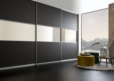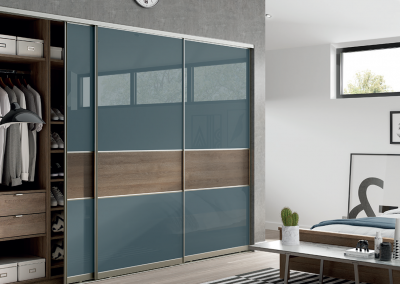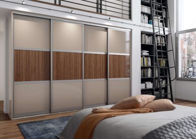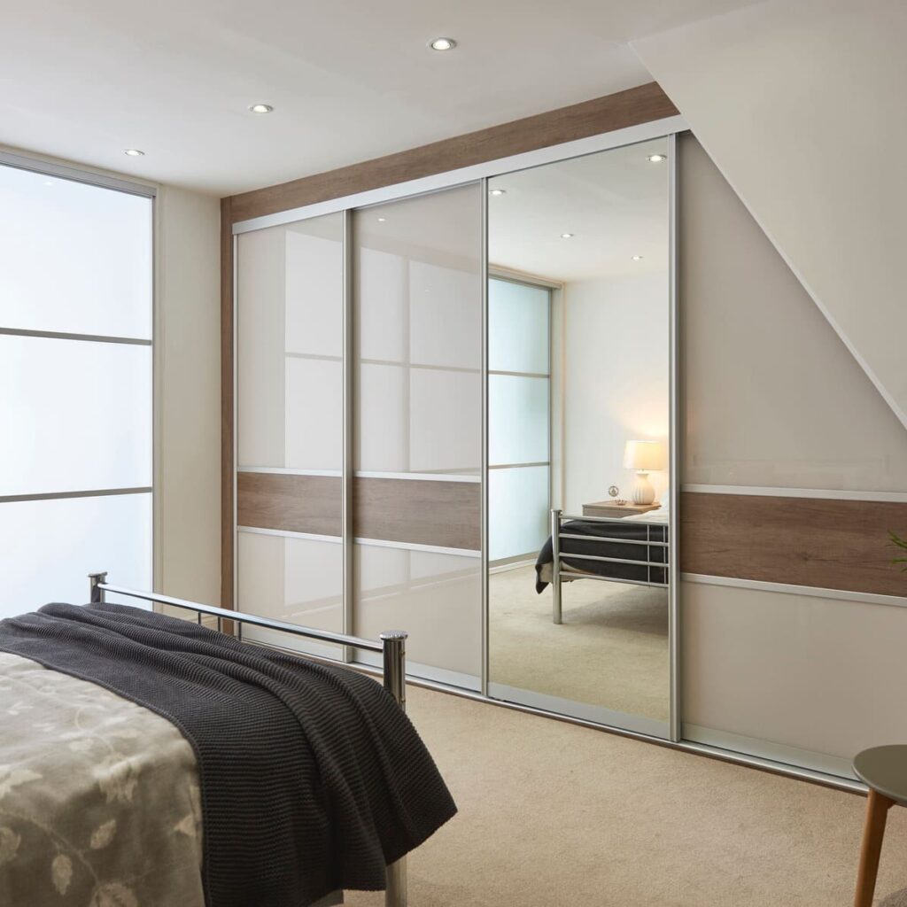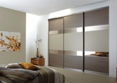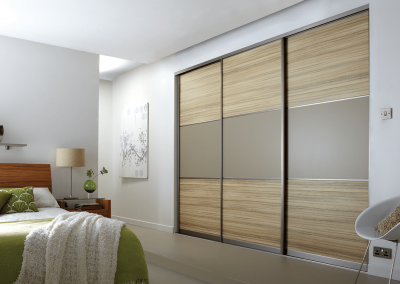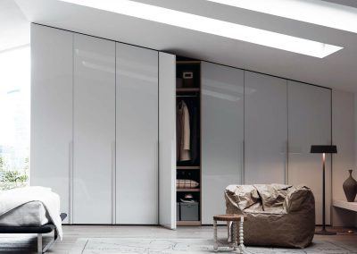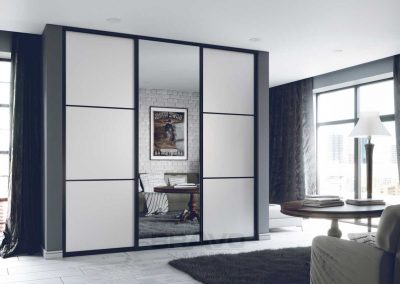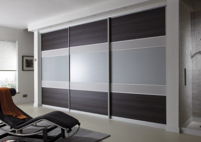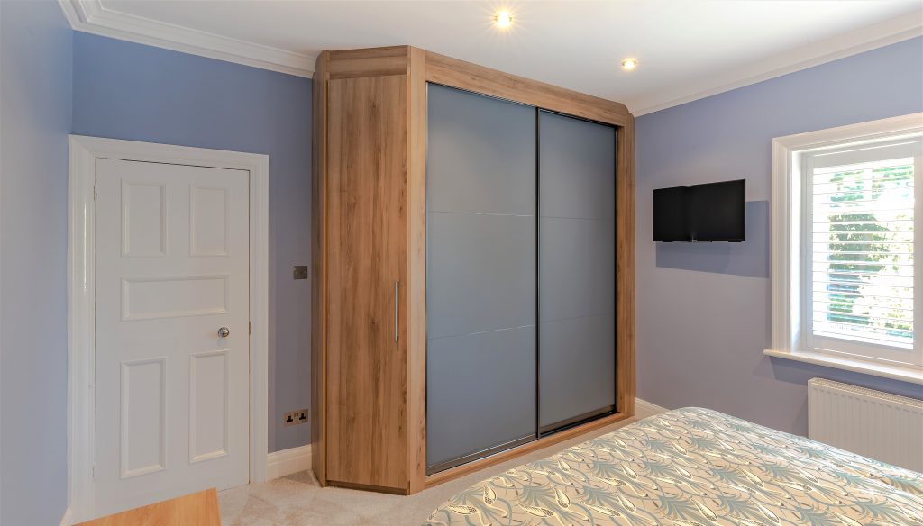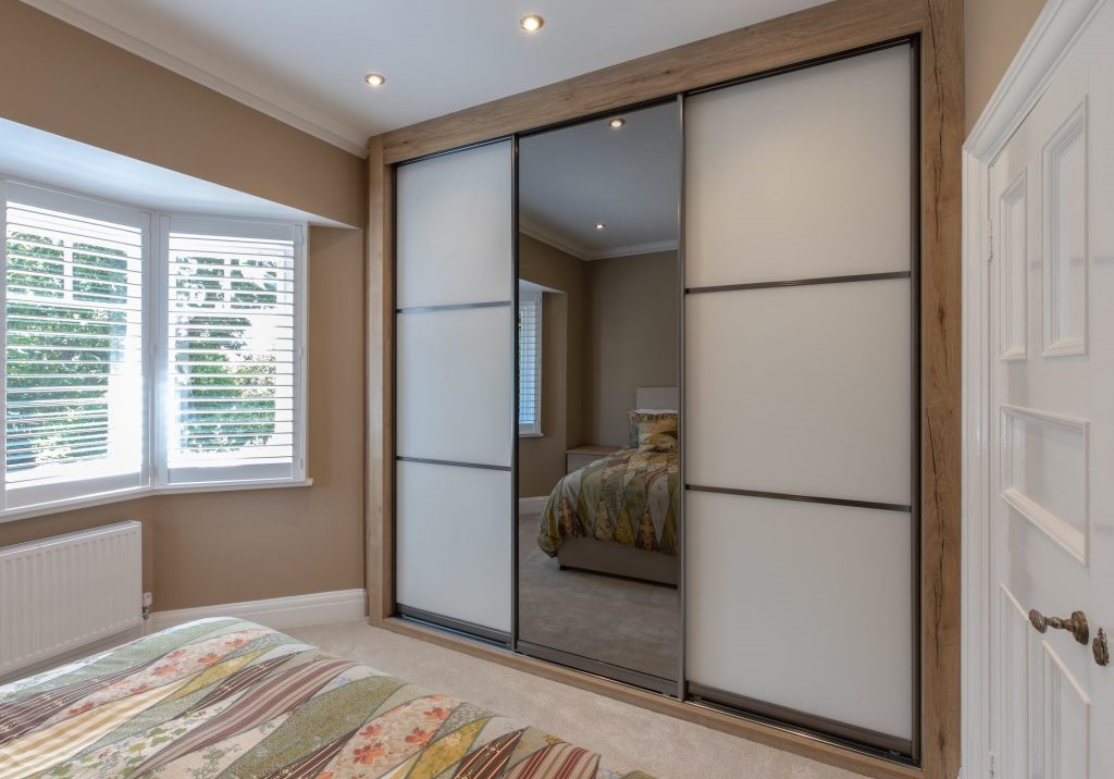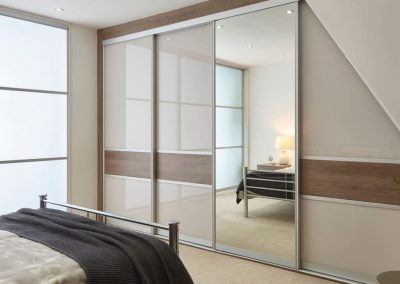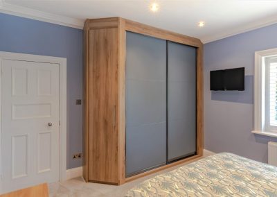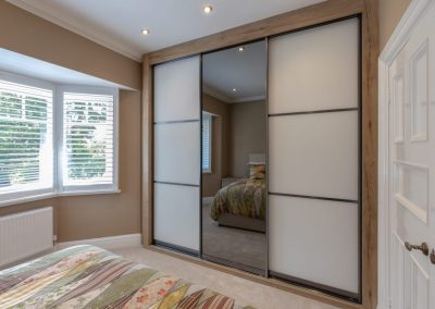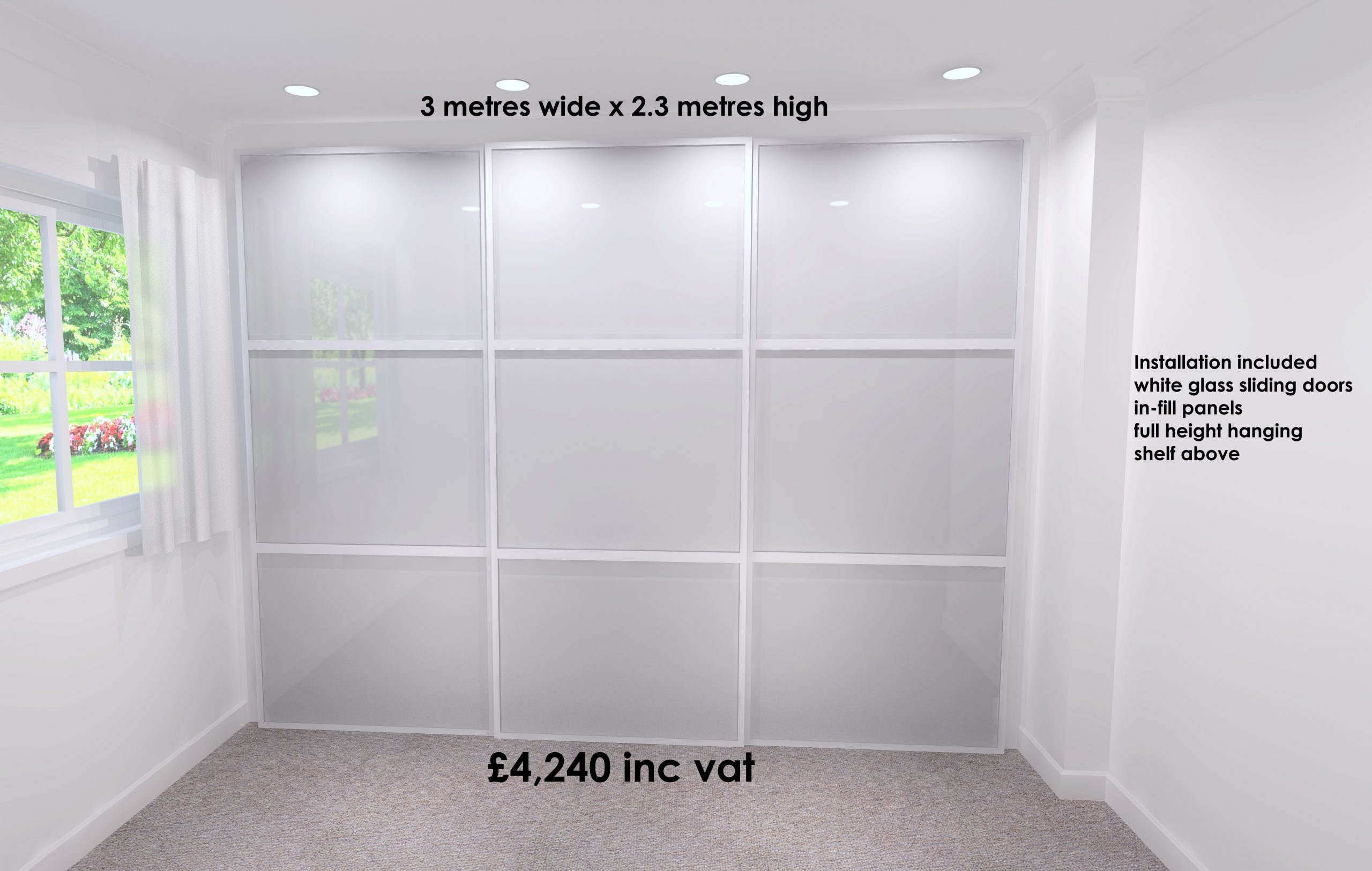 This fitted bedroom wardrobe is constructed using high quality, sustainable Egger boards & white glass sliding doors. In-fill panels precisely cut to the walls and ceiling ensure a seamless fit to the room. The interior contains full height hanging divided into 3 sections & a shelf above. All designed, supplied & installed on the Isle of Wight for £4240 inc VAT