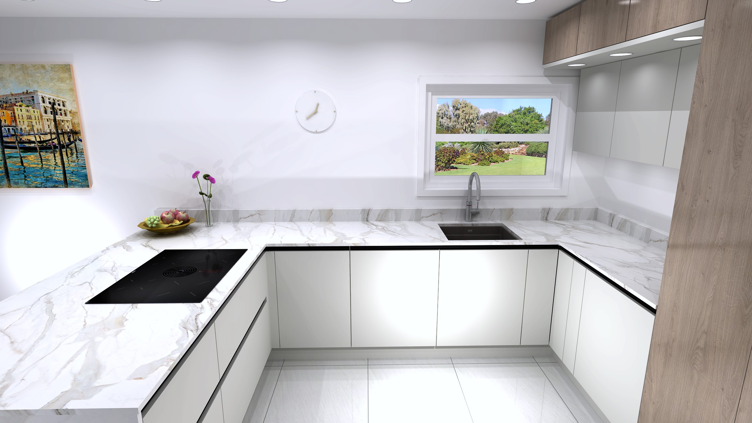 Nolte Sahara cabinets, marble effect laminate worktop, cabinets, appliances, project management & installation £7000 – £8000
